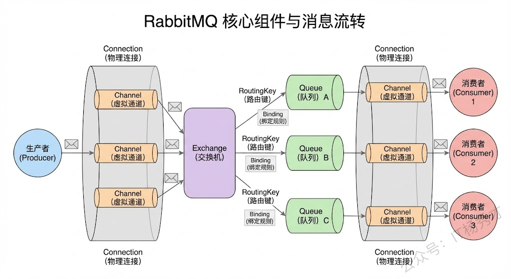 理解RabbitMQ的核心组件,最好的方式是跟踪一条消息从生产到消费的完整旅程,搞清楚每个组件在这条链路上扮演什么角色、为什么需要它。