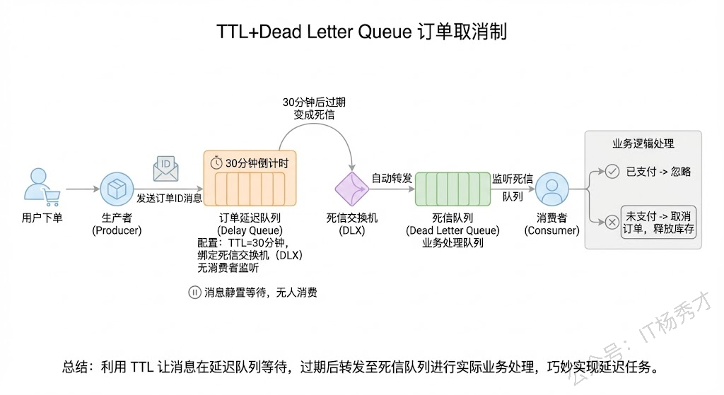 用户下单 → 生产者发一条消息(内容是订单ID)到"订单延迟队列",这个队列的配置:TTL=30分钟,绑定了死信交换机,没有消费者监听(这很重要,就是要让消息在里面等到过期)