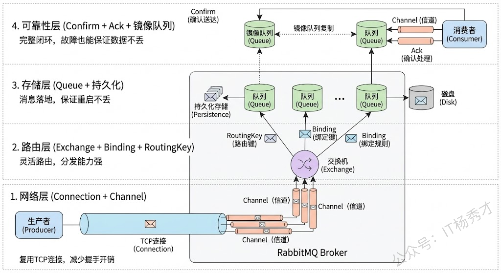 可靠性层(Confirm + Ack + 镜像队列)——生产者confirm保证消息送达Broker,消费者ack保证消息被成功处理,镜像队列保证单台机器故障数据不丢。三者配合构成完整的可靠性闭环。