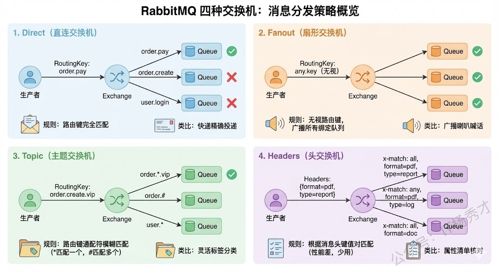 四种交换机本质上代表四种不同的消息分发策略,理解它们的关键是搞清楚每种交换机"怎么决定消息该发给谁"。