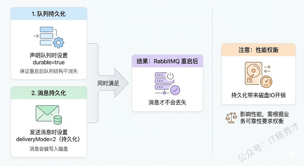 消息持久化,队列和消息都要配置持久化,确保Broker重启后消息还在,比如RabbitMQ设置durable=true。