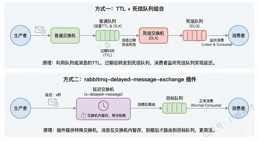原理:给消息设置一个TTL(比如30分钟),消息在普通队列里"等死"。30分钟内没有消费者消费它(其实也不该有消费者监听这个队列),消息过期了,变成"死信"。而这个队列预先配置了死信交换机,过期消息会被自动转发到死信队列。消费者监听死信队列,收到的消息就是"延迟30分钟后的消息"。本质上是用"等过期"来模拟"延迟投递"。