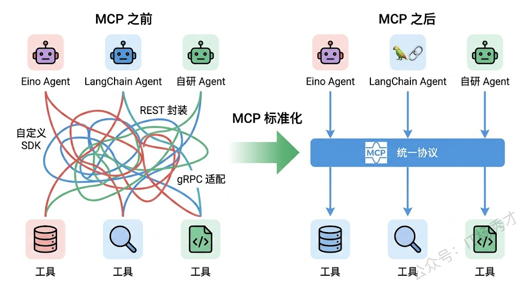 在前面几篇文章里,我们给 Agent 定义工具的方式都是硬编码——在 Go 代码里写好工具函数,通过 utils.NewTool 包装成 Eino 的 Tool 接口,然后绑定到 Agent 上。这种方式在项目初期完全够用,但随着系统规模变大,问题就来了:你的 Agent 需要调用的工具可能散落在不同的服务里,有的是 Python 写的数据分析脚本,有的是 Java 写的企业内部 API,有的是第三方 SaaS 平台的能力。难道每个工具都要在 Go 里重新实现一遍吗?
