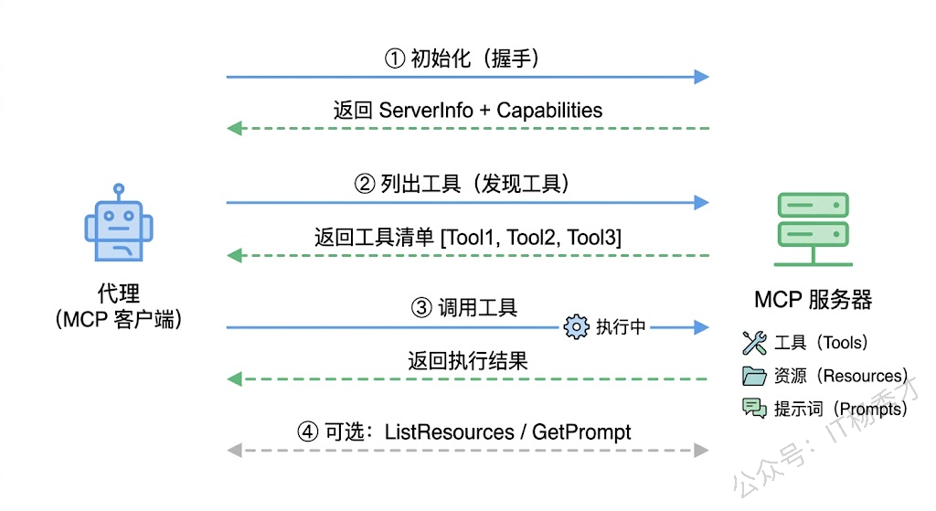 在实际 Agent 开发中,Tools 是用得最多的能力类型——毕竟 Agent 的核心价值就是"能做事",而做事就需要调用工具。Resources 和 Prompts 在某些场景下也很有用,但相对来说是锦上添花。所以我们后面的实战会重点围绕 Tools 展开。