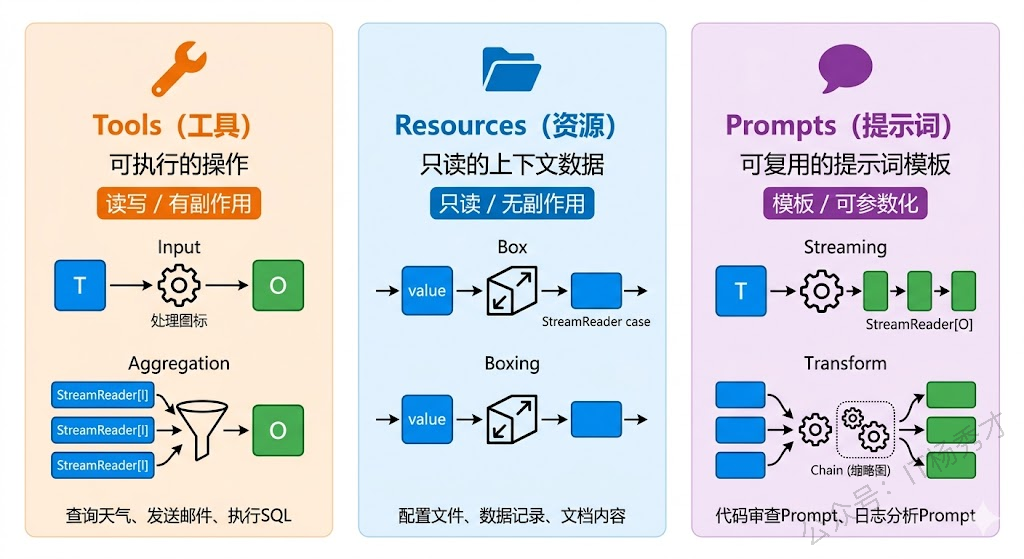 MCP Server 可以暴露三类不同性质的能力,各自解决不同的问题。
