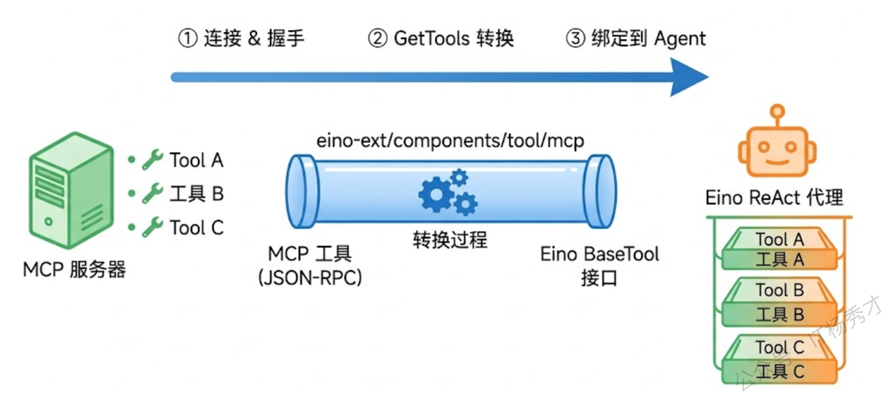 手动用 MCP Client 调用工具虽然可以工作,但在实际 Agent 开发中我们不会这么干。我们需要的是把 MCP Server 上的工具无缝"变成"Eino 的 Tool 接口,这样就能直接丢给 ReAct Agent 使用,Agent 自己决定什么时候调、怎么调。