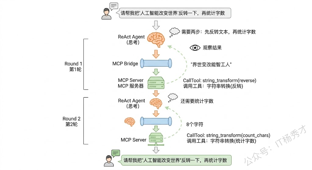 最后一个问题特别值得关注——用户的需求涉及两步操作(先反转、再统计字数),Agent 自动识别出来需要调用两次 string_transform 工具(一次用 reverse 操作,一次用 count_chars 操作),分步执行后把结果综合起来回复给用户。这正是 ReAct 框架"思考-行动-观察"循环的威力:Agent 不是一次性把所有事情做完,而是每次思考下一步该做什么,执行一个工具,观察结果,然后决定是否需要继续。