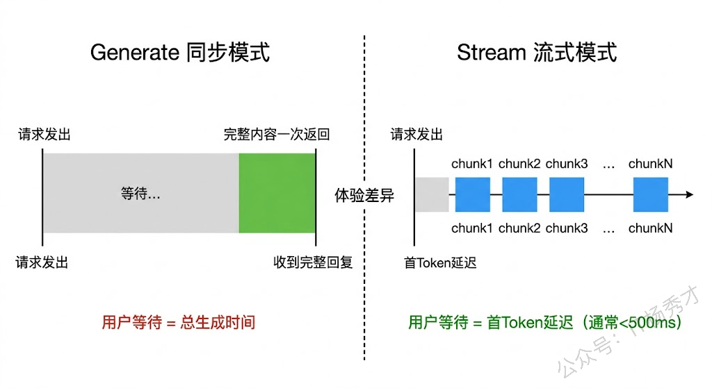 流式模式还有一个不太直觉但很实用的优势:降低首 Token 延迟。在同步模式下,你需要等模型完全生成结束才能拿到响应;在流式模式下,模型产出第一个 Token 你就能收到了。对于对响应速度敏感的应用(比如实时客服),这个差异很明显。