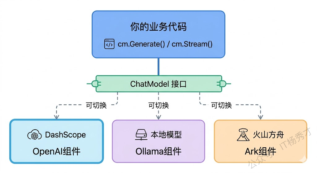 实际项目中你很可能需要对接不同的模型提供商——开发调试用本地的 Ollama 免费模型,生产环境用通义千问的 API。Eino 的组件化设计让这种切换变得很简单:所有模型实现都满足同一个接口,你的业务代码不需要改任何东西。