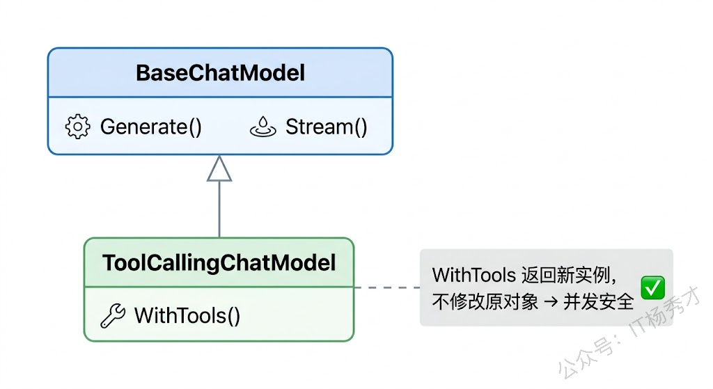 在 Agent 场景中,模型不仅要能聊天,还要能调用工具。ToolCallingChatModel 就是为此而生的,它在 BaseChatModel 基础上加了一个 WithTools 方法:
