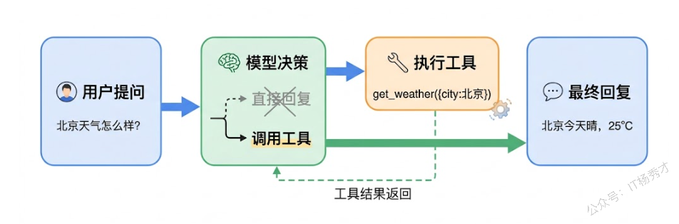 未绑定工具的实例回复: 我不知道北京今天的天气情况。建议您查看权威天气预报平台或使用天气应用获取最新信息。这段代码清楚地展示了两个关键点。第一,绑定了工具的 cmWithTools 实例知道自己有 get_weather 这个工具可用,所以当用户问天气时,它选择输出一个工具调用请求而不是直接文本回复。第二,原始的 cm 实例没有绑定工具,所以它只能老老实实告诉你"我查不了天气"。这就是 WithTools 返回新实例的好处——两个实例互不干扰。