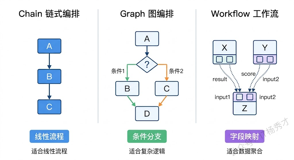 | 编排方式 | Chain/Graph/Workflow | Chain/Graph | Chain |