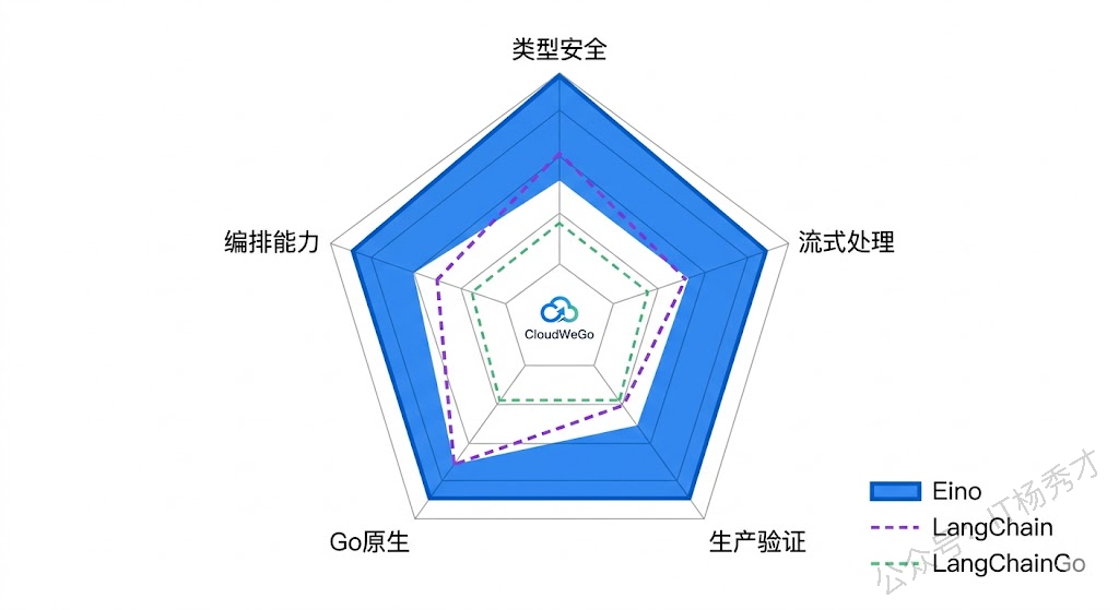 Eino 的差异化优势在于几个方面。首先是Go 原生设计——接口抽象、类型检查、并发处理这些都是按 Go 的方式来的,写出来的代码就是正常的 Go 代码,用 GoLand 或者 VS Code 的 Go 插件就能享受完整的代码补全和类型检查。其次是编译时类型安全——Graph 编排在 Compile 阶段就会检查上下游节点的类型是否匹配,不像动态语言框架那样等运行到某个节点才报 "type mismatch" 错误。然后是生产环境验证——字节内部数百个服务在跑,这个可靠性背书是很多开源框架没有的。最后是流式处理的第一优先级——大模型的输出天然是流式的,Eino 在编排层就自动处理了流的拼接、拆分、复制和合并,你不需要自己操心这些麻烦事。