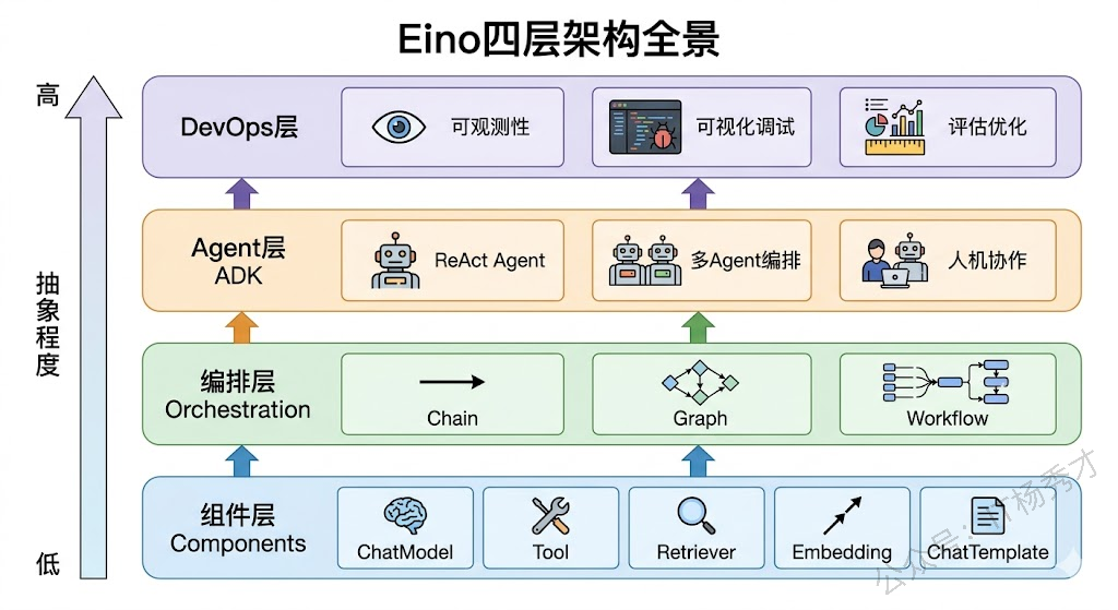 Eino 的整体架构可以拆分成四个层次:组件层、编排层、Agent 层和DevOps 层。这四个层次从底到顶,越往上抽象程度越高,使用起来也越简单。