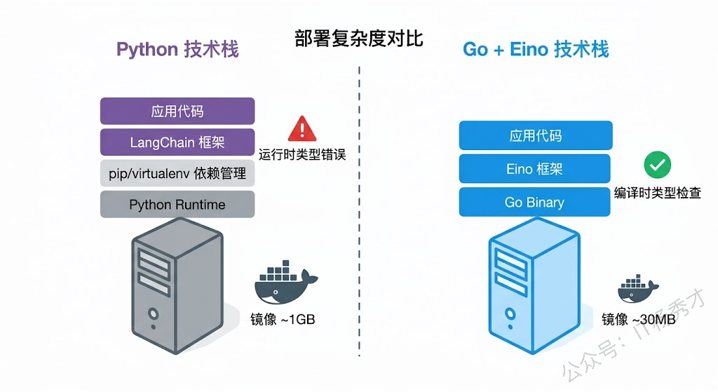第四个理由是团队技术栈统一。如果你的后端服务已经是 Go 写的(国内不少公司都是如此),用 Go 来做 Agent 应用意味着团队不需要多学一门语言、不需要多维护一套技术栈、不需要在 Go 服务和 Python 服务之间搞进程间通信。代码审查、部署流程、监控体系全都复用现有的。