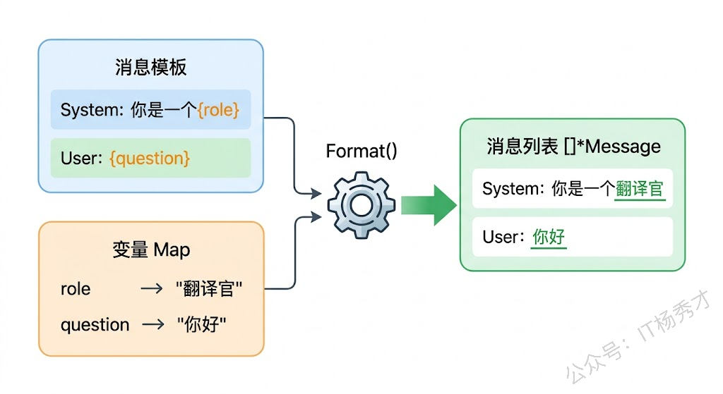 }Format 方法接收一个变量 map,返回填充好的消息列表。Eino 提供了一个开箱即用的实现——prompt.FromMessages,用它来创建模板非常方便。