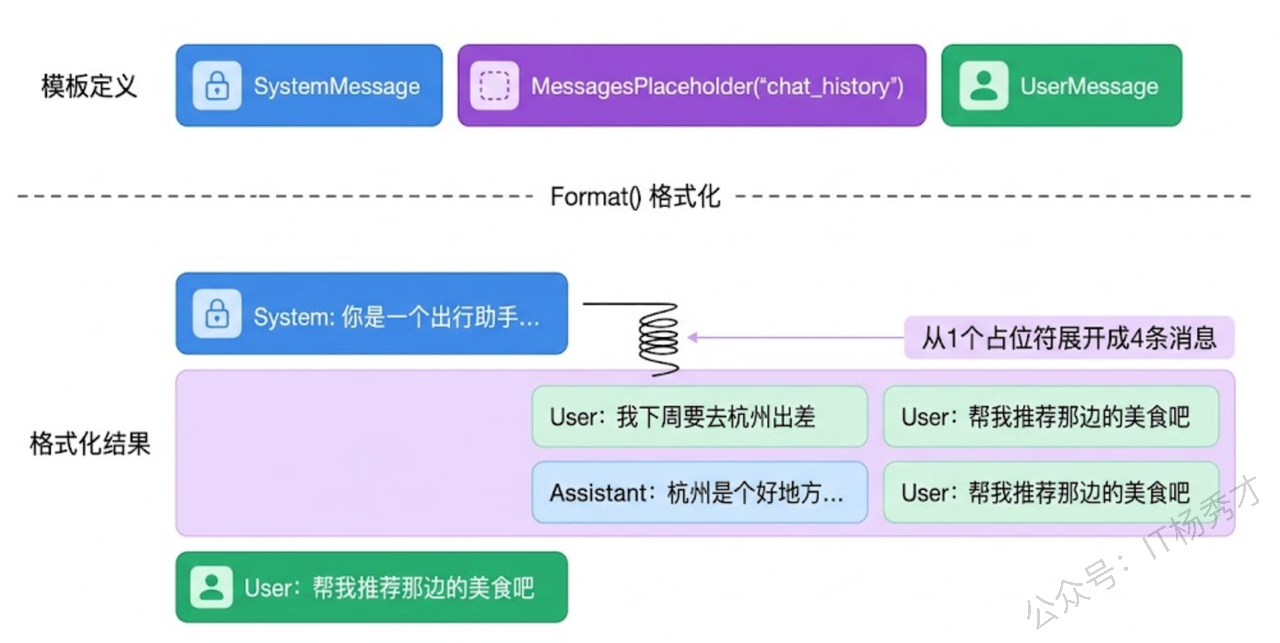 MessagesPlaceholder 就是干这个的。它在模板中"占一个位置",运行时把这个位置替换成一组消息。