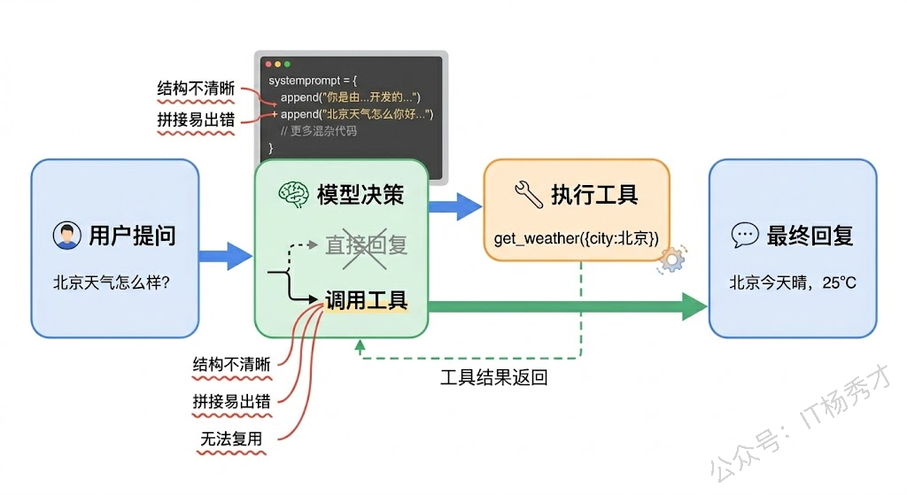 }这段代码能用,但有几个明显的问题。首先,Prompt 的结构和业务逻辑混在一起了——你要读懂整个函数才知道消息列表的结构是"System + 历史记录 + 用户问题"。其次,字符串拼接既丑又容易出错,比如忘了空格或者引号嵌套。最后,如果要把这个 Prompt 结构用在另一个场景(比如不同的 System Prompt 但结构一样),就得把整个函数复制一份改 System 内容。