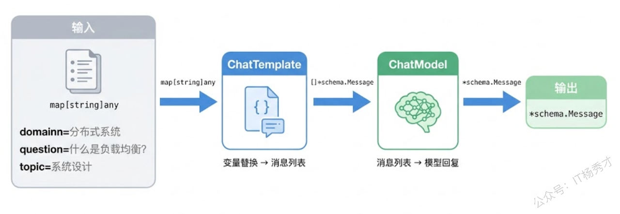 前面的例子都是手动调用 template.Format() 再把结果传给 cm.Generate(),两步操作。在 Eino 的编排体系中,ChatTemplate 是一等公民——你可以直接把它嵌入 Chain 或 Graph 中,让编排引擎自动完成"模板格式化 → 模型调用"的流程。