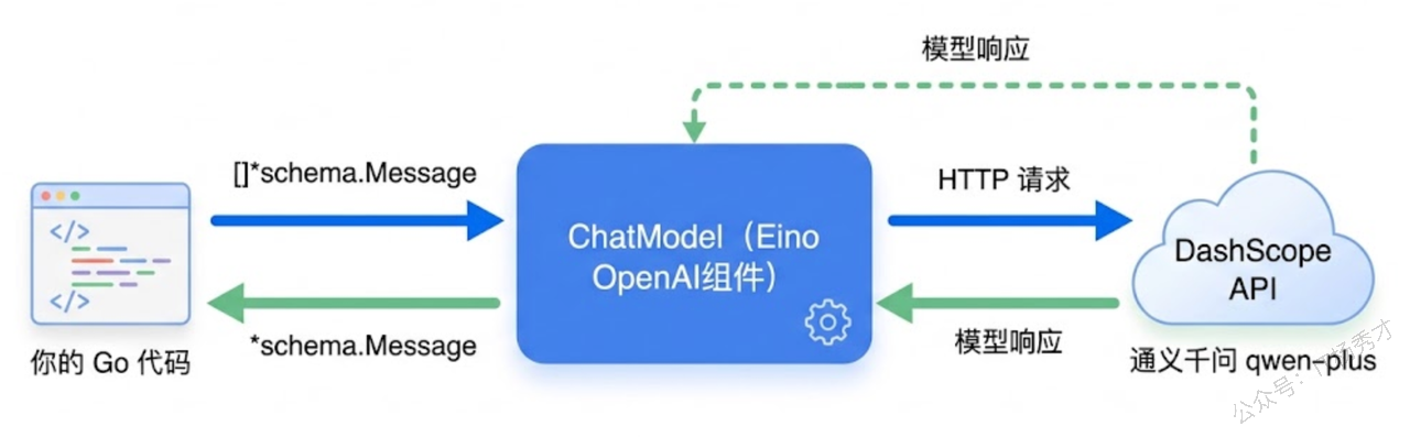Goroutine 是 Go 语言中由运行时(runtime)管理的轻量级线程,通过 `go` 关键字启动,具有极小的初始栈空间(约 2KB),可高效并发执行函数。这段代码做了三件事。第一步是创建 ChatModel 实例,通过 openai.NewChatModel 函数,传入 ChatModelConfig 配置,其中 BaseURL 指向通义千问的 DashScope API 地址,APIKey 从环境变量读取,Model 指定用 qwen-plus 模型。因为 DashScope 的接口协议兼容 OpenAI,所以 Eino 的 OpenAI 组件可以无缝对接,不需要任何额外适配。