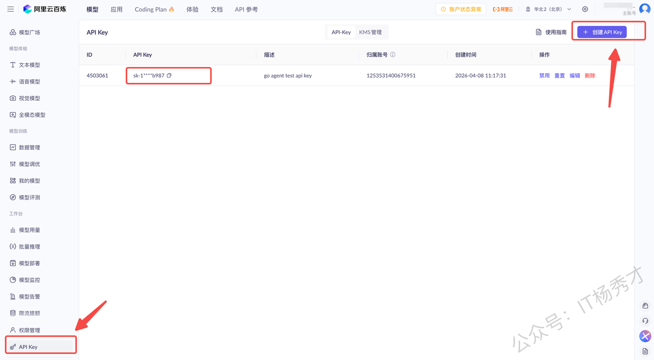 - 进入控制台后,在左侧导航找到"API Key 管理",点击"创建 API Key"