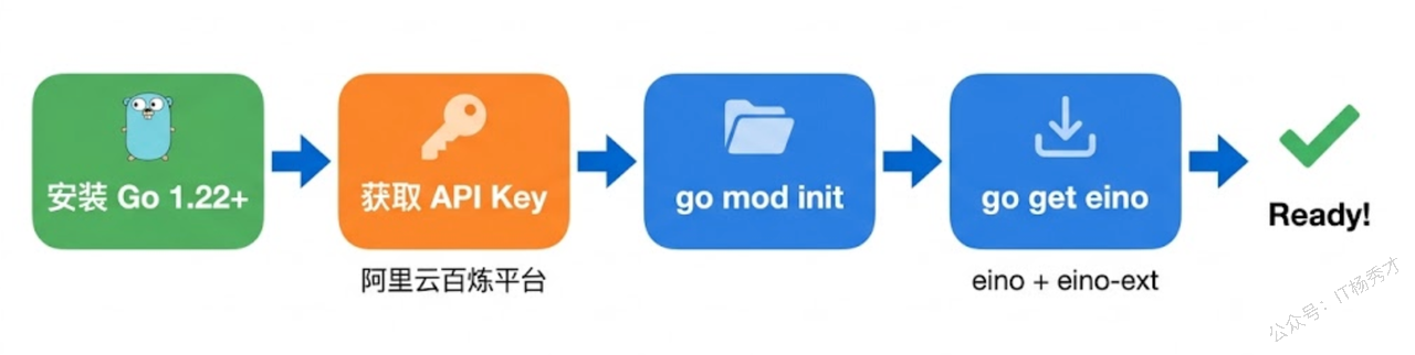 这篇文章我们就快速上手Eino框架,从搭建 Eino 开发环境开始,然后用通义千问的 DashScope API 作为底层大模型,写出第一个 Eino 程序,并且分别体验同步调用、流式输出和多轮对话三种模式。文章里的每一段代码都是完整可运行的,跟着做就能跑通。