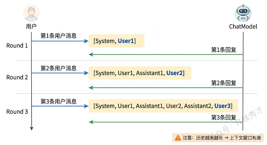 到目前为止我们的例子都是单轮问答——发一条消息、拿一个回复,没有上下文。但真实的对话场景中,你需要模型记住之前聊了什么。实现多轮对话的原理很简单:把历史消息都放到消息列表里一起发给模型。