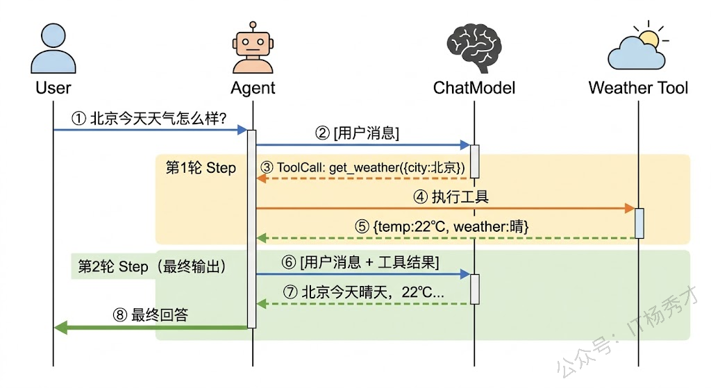 调用 agent.Generate 时,Agent 内部实际发生了这些事:先把用户消息发给模型,模型分析后决定调用 get_weather 工具,Agent 执行工具拿到天气数据,再把工具结果返回给模型,模型最终组织了一段自然语言回答。整个过程对你来说就是一个函数调用。