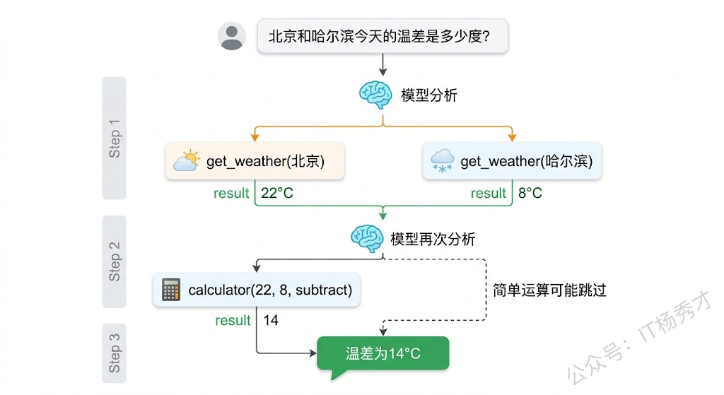 测试2 展示了另一种模式:用户一句话里包含两个独立的需求,Agent 需要分别调用时间工具和天气工具,然后把两个结果合并成一个完整的回答。这种能力不需要你写任何特殊逻辑,模型在 ReAct 循环中自然就能处理。