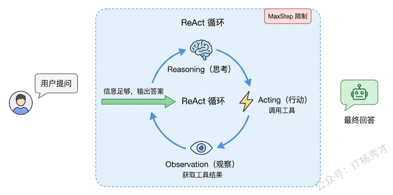 在 Agent 认知篇里我们从理论层面聊过 ReAct,这里快速回顾一下它在代码层面的运作流程,帮你建立直觉。