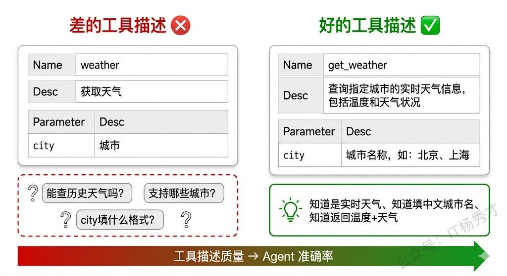 工具描述决定了 Agent 的智商。 这一点怎么强调都不过分。模型是根据工具的 Name 和 Desc 来决定何时调用哪个工具的。如果你的工具描述含糊不清,模型就可能在不该调用时调用、该调用时不调用,或者调用了错误的工具。好的工具描述应该准确说明工具的功能边界,最好带上使用场景的暗示。比如"查询指定城市的实时天气信息"就比"获取天气"要好得多——后者太模糊了,模型不知道它能处理"昨天的天气"还是"未来一周的天气预报"。