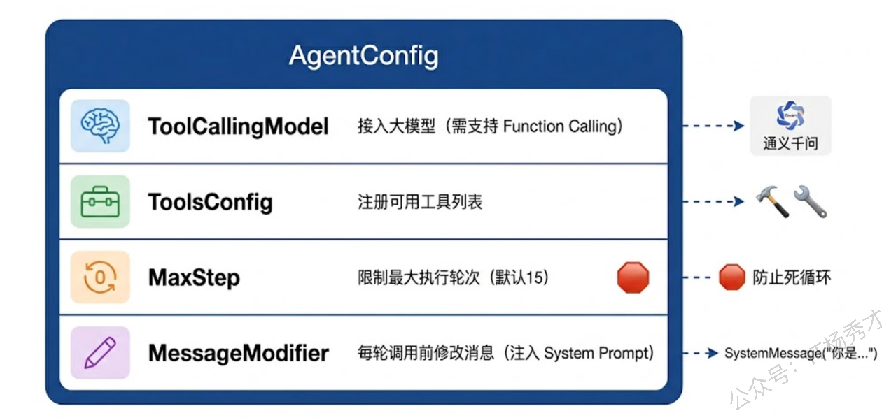 react.AgentConfig 是 ReAct Agent 的配置核心,前面的示例只用了最基础的两个字段。实际开发中你可能需要更多控制,下面逐个拆解。