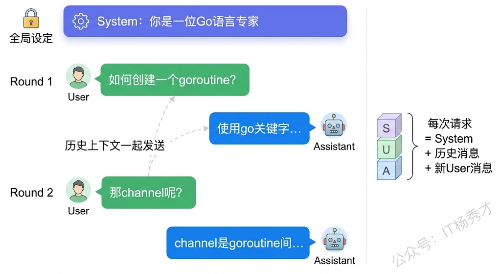 System(系统消息) 用来设定模型的行为准则和角色定位。比如"你是一位资深的 Go 语言专家,请用简洁专业的语言回答问题"。System 消息只在对话开头设置一次,模型会在整个对话过程中遵循这个设定。你可以把 System 消息理解为给模型装了一个"人设"——就像一个演员拿到了角色说明,后面的所有表演都会基于这个角色来演。