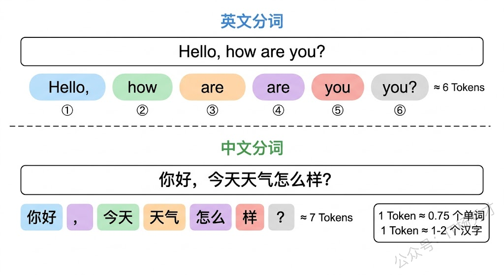 举个具体的例子。英文句子 "Hello, how are you?" 通常会被切分成大约 6 个 Token:Hello、,、 how、 are、 you、?。而中文句子"你好,今天天气怎么样?"大约会被切分成 7-9 个 Token,因为一些常见词(如"今天"、"天气")可能被当作一个 Token,而不那么常见的组合就会被拆成单字。