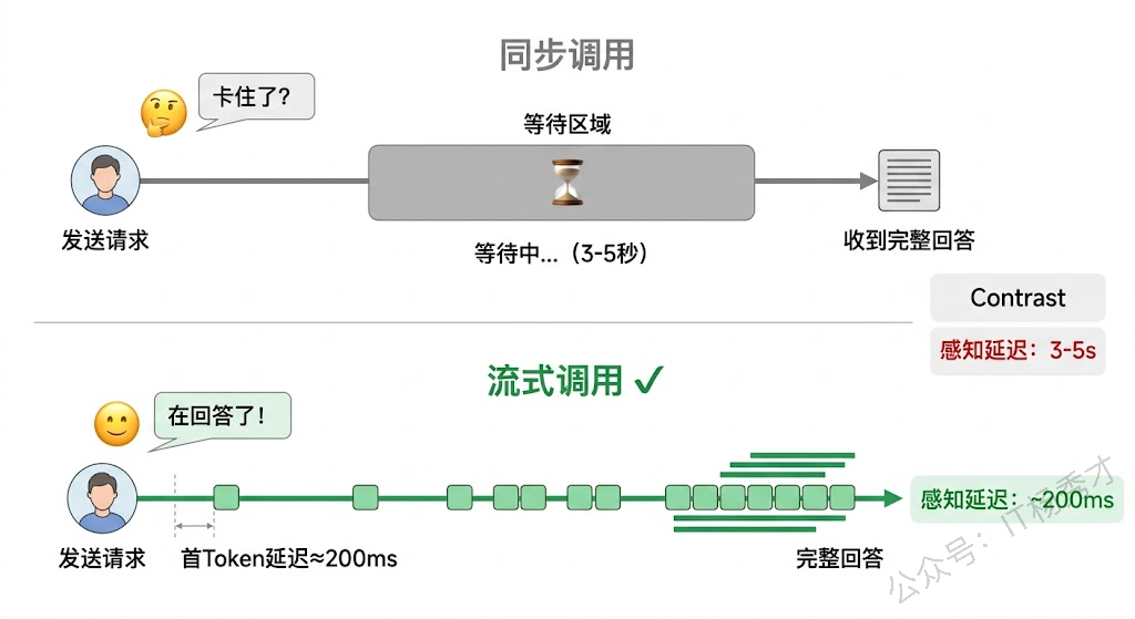 流式调用极大地提升了用户体验。用户几乎在发送请求后的几百毫秒内就能看到模型开始"打字",心理等待感大大降低。这也是为什么 ChatGPT、Claude 等产品都默认使用流式输出——那种逐字生成的效果不仅降低了感知延迟,还给用户一种"模型正在思考"的即时反馈。