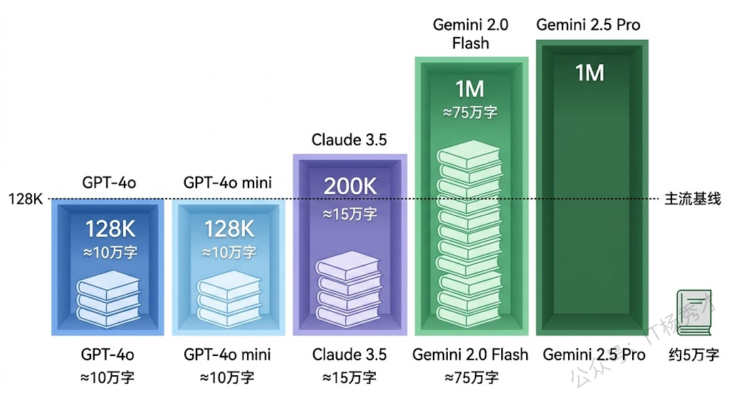 其次是上下文窗口。大模型能处理的最大文本量也是用 Token 来衡量的。GPT-4o 的上下文窗口是 128K Token,Claude 3.5 是 200K Token,Gemini 2.5 Pro 更是达到了 1M Token。超过这个限制,模型就"看不到"前面的内容了。