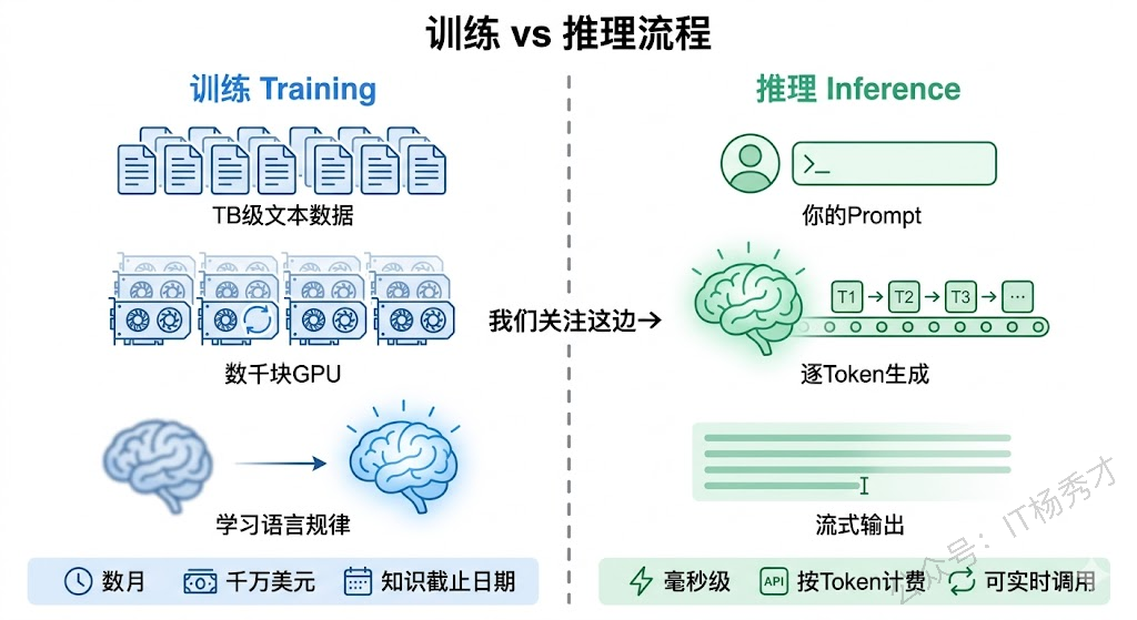 推理就是"用"模型的过程——你给模型一段输入(Prompt),模型根据训练学到的知识生成输出。我们每次调 API 做的就是推理。