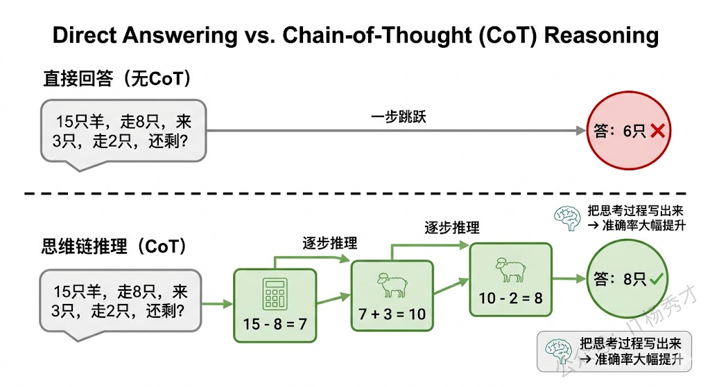 举个例子:你问模型"一个农场有 15 只羊,走了 8 只,又来了 3 只,后来又走了 2 只,现在有多少只?"这种简单算术人类一步步算就行了,但模型有时候会直接蹦出一个错误答案——因为它试图一步到位而没有展开中间推理过程。