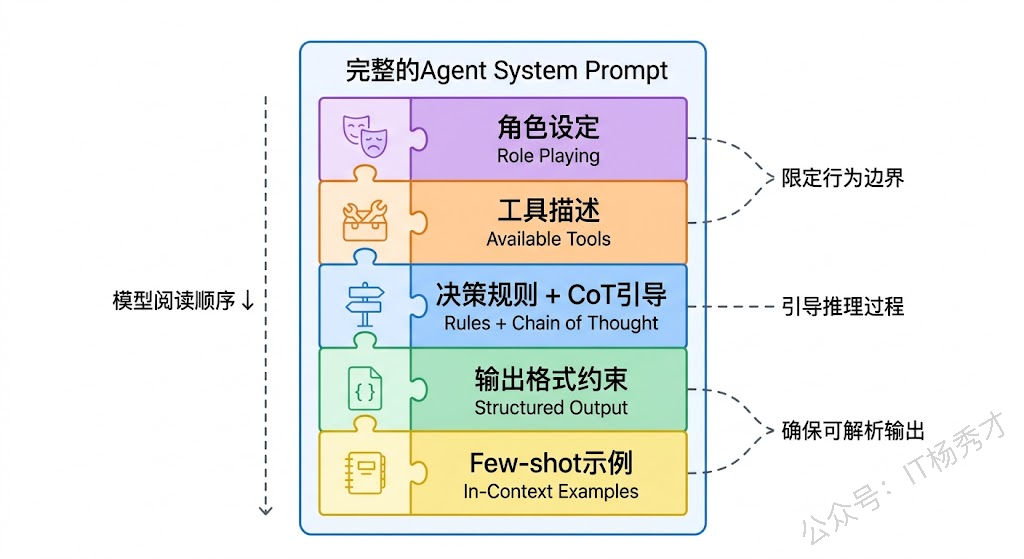 前面讲了各种技巧和模式,最后我们来看看这些技术在真实 Agent 系统中是如何组合运用的。一个完整的 Agent 系统通常需要设计多个 Prompt,它们各司其职又相互配合。