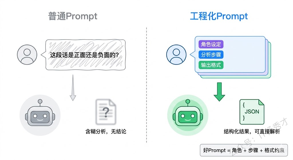 两段 Prompt 解决的是同一个问题,但第二段通过设定角色、明确输出要求、引导分析步骤,得到了一个精准且可编程处理的结果。这就是 Prompt Engineering 的价值所在——不是让大模型更聪明,而是让大模型把它的聪明用对地方。
