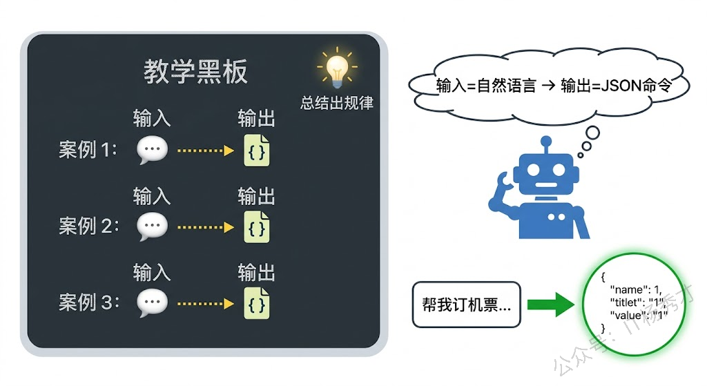 Few-shot 的核心思路非常基础:给模型几个"输入→输出"的例子,让它从例子中总结出规律,然后按照同样的规律处理新的输入。这就像你教一个新同事做数据标注,与其给他写一页 A4 纸的标注规范,不如直接丢几个标注好的样本让他照着做——后者往往更有效。
