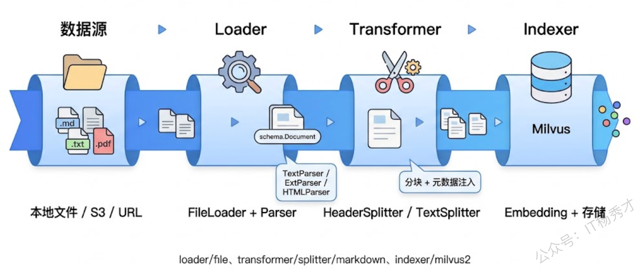 分块完成后,下一步就是把块存入向量数据库。这一步我们在上一篇已经很熟悉了——用 Eino 的 Indexer 组件,一行 Store 搞定。把 Loader → Splitter → Indexer 串起来,就是一条完整的 RAG 数据预处理管道。