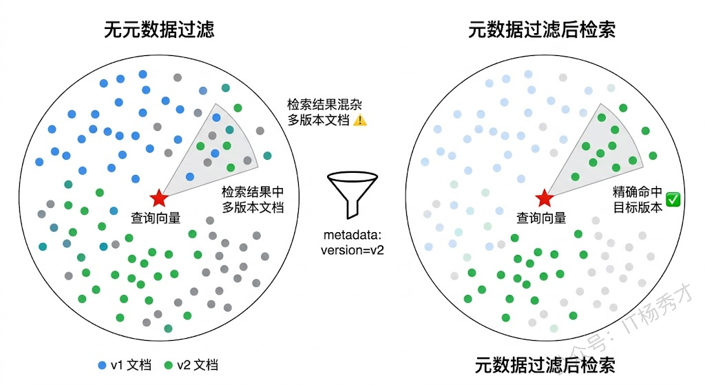 这些元数据在检索时可以用来做过滤。比如用户问"v2 版本的部署流程",你可以先用元数据过滤出 version=v2 的文档块,再做语义检索,比在全量文档中检索准确得多。Milvus 等向量数据库都支持在向量检索的同时做标量过滤,Eino 的 Retriever 也支持传入过滤条件。