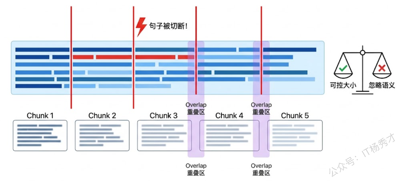 固定长度分块是最直观的策略——设定一个最大长度(比如 500 个字符),然后从头到尾按这个长度把文本切成一段一段的。为了避免上下文被硬切断,通常还会设置一个"重叠区"(Overlap),让相邻的两个块之间有一部分内容是重复的。