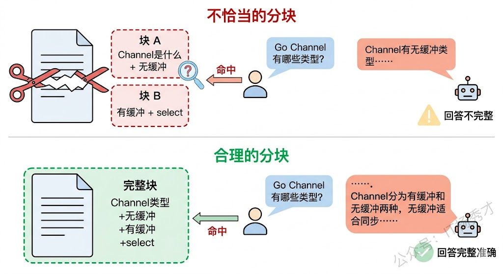 使用select语句可以同时监听多个Channel的读写事件。如果你在第二行中间把它切开,前半块讲了"Channel 是什么 + 无缓冲 Channel",后半块讲了"有缓冲 Channel + select"。当用户问"Go Channel 有哪些类型"时,前半块只包含无缓冲的信息,后半块只包含有缓冲的信息,两个块各自都不完整。模型拿到其中一个块作为参考,给出的回答就会有遗漏。