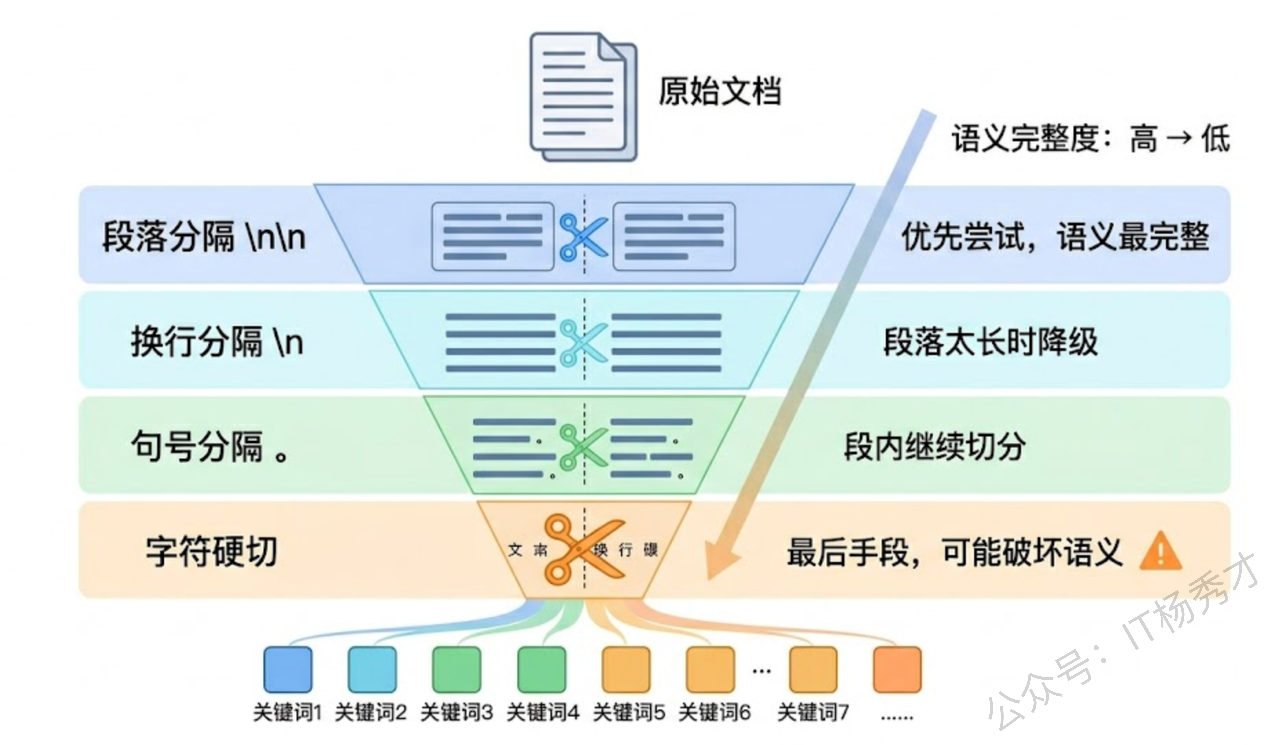 这个策略的精妙之处在于它尽量按段落切,段落太长就按句子切,句子太长就按逗号切——每一层都优先选择语义最完整的切割方式。只有当所有自然分隔符都用尽了,才退化为按字符硬切。
