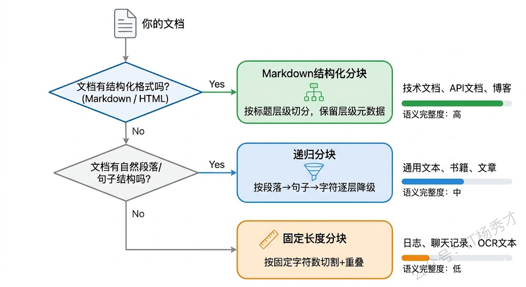 三种分块策略——固定长度、递归分块、Markdown 结构化分块——不是互相替代的关系,而是各有适用场景。选策略的关键是看你的文档长什么样:有标题层级的用结构化分块,有段落结构的用递归分块,什么结构都没有的才用固定长度兜底。实际项目中往往需要混合使用,甚至在结构化分块之后再套一层递归分块处理过长的段落。块大小、重叠区、元数据注入这些参数没有标准答案,需要你根据实际的文档特点和测试 Query 来调优。RAG 的效果调优本质上是一个工程问题,而 Chunking 是这个工程问题中最值得花时间的第一步。